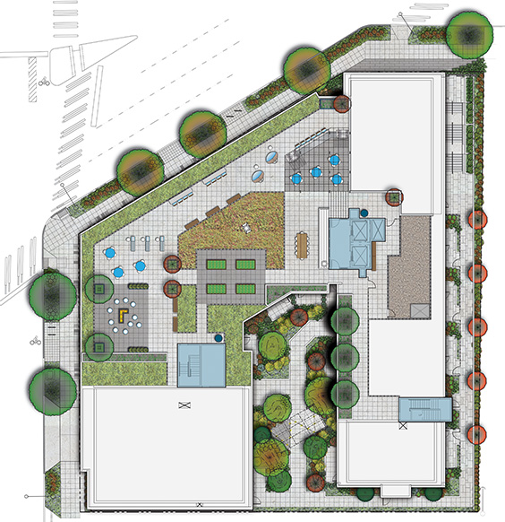 To navigate the grade down to the private Mews, the design team will integrate tiered planters, a staircase with a bike runnel and adequate lighting to provide a safe and energetic space. Private terraces will have special accent paving, raised planting and fence/gate elements. The private interior courtyard will be surrounded by private terraces that will be buffered by lush planting in raised planting beds. The vegetated oasis will be reinforced by incorporating low berming, adding to the verticality and variety of the planting scheme. The planting will consist of a plant palette that plays with the senses with various textures, colors, fragrances and scales. The focal point of the courtyard will be an open-cabana structure that will have small group seating and ambient lighting.