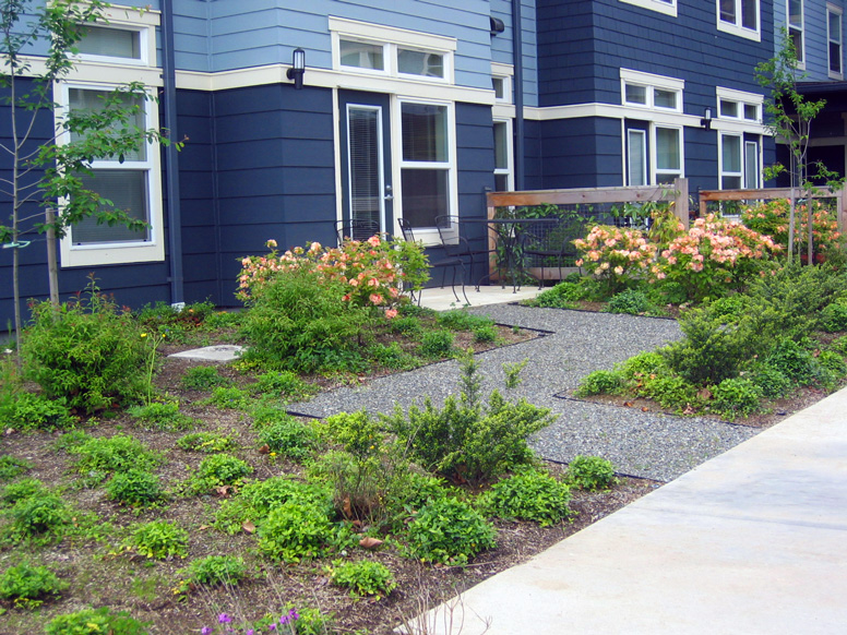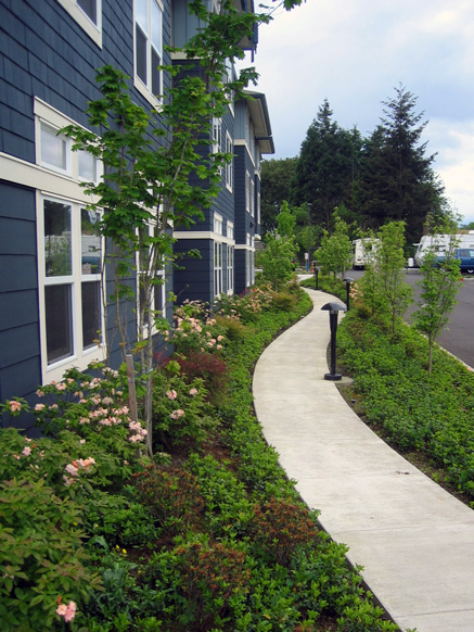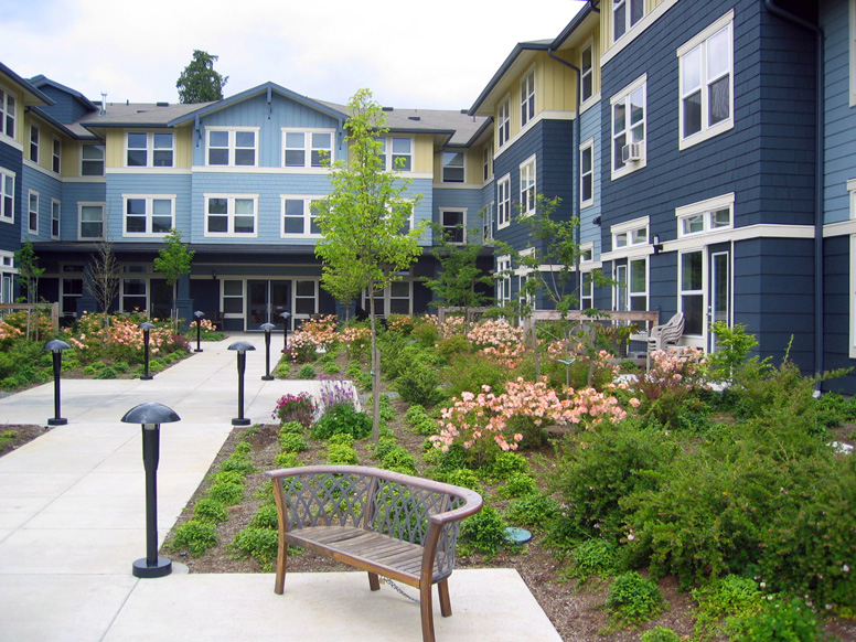 Fazio Associates designed landscaped outdoor semi-private terraces for the ground floor units in the courtyard formed by the U-shaped building. Drought tolerant plantings were chosen to limit the amount of irrigation needed and to minimize the amount of long-term maintenance for all landscaped areas. Other landscaping elements designed by Fazio Associates include walks, trellis with climbing vines near entrances and focal points, and an open lawn area off of the courtyard to capture sited views towards Angle Lake and Mt. Rainier, putting the users in visual touch with a range of nature elements close to home and beyond.