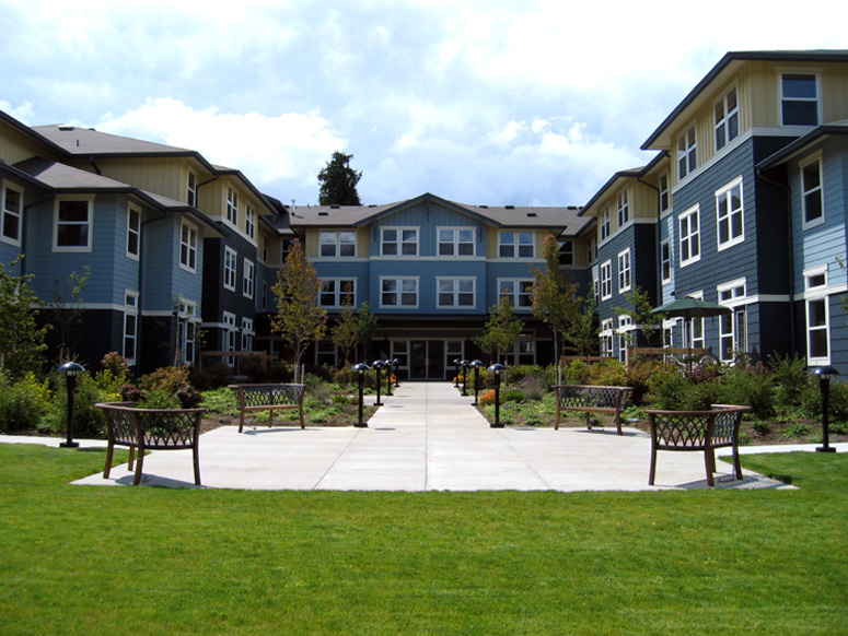 The first phase of this Low Income Senior Housing project in SeaTac, WA, included 80 one- and two-bedroom units, two community rooms, a common kitchen, a library, and laundry facilities on three floors.
