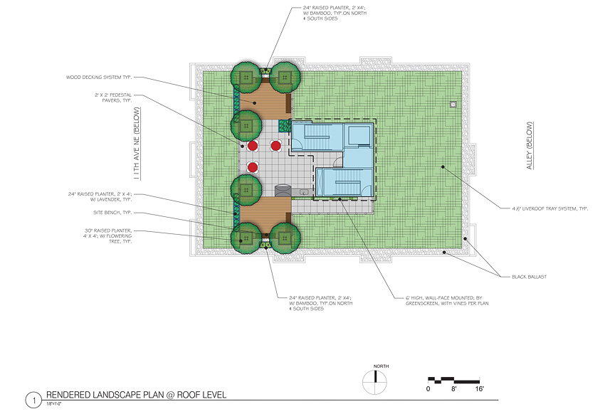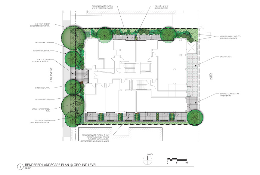 Fazio Associates designed the streetscape, private patios and roofdeck elements. The shallow street frontage allows for the replacement of two Green Ashes, and new flowering trees and shrubs to enhance the pedestrian experience. Two bioplanters at the front corners of the building treat stormwater from the roof. The private sunken patios have raised planters and greenscreens with climbing vines to provide privacy and delineate space. The roofdeck includes a greenroof tray system, outdoor kitchen, raised planters with shrubs and flowering trees, and benches. The roofdeck emphasizes the views out west to the Olympic Mountains and to downtown Seattle.