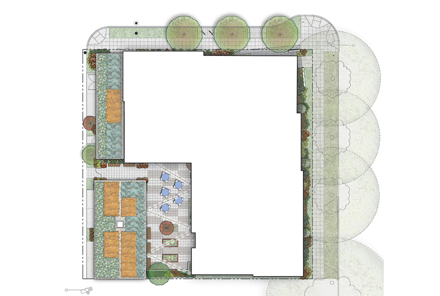 Fazio Associates designed the streetscape, courtyard, and greenroof elements. Large existing Willow Oaks along Rainier Ave. S. will be retained. The building will be set back, allowing for a generous planting area with a variety of large and small shrubs, and groundcover, to screen the building and enhance the pedestrian experience. The building entry at the corner will be reinforced with scored concrete set at an angle that reflects the canopy above and concrete site walls that also act as signage. The addition of a sidewalk, street trees, and bike racks along S. Estelle St. will make it pedestrian friendly. Planting beds with shrubs and small trees along the alley will help soften the facade. At the entry into the courtyard from the alley, shrubs and a screening element will help create privacy. Along the breezeway, bicycle racks, benches, and a greenscreen will activate the space and lead into the courtyard. The courtyard will feature raised p-patch planters, a large bioplanter, a cistern for harvesting rainwater, benches, small trees in at grade planting beds, a cable trellis system with climbing vines on the back of the garage to soften that facade, and scored concrete with accent color. The concrete scoring and accent color will continue into the garage through a second large garage door that can be opened up to provide an auxiliary space for large events. The roof of the garage and a portion of the second floor will be covered in greenroof to provide a pleasant view from above, for residents and for neighbors up the hill.