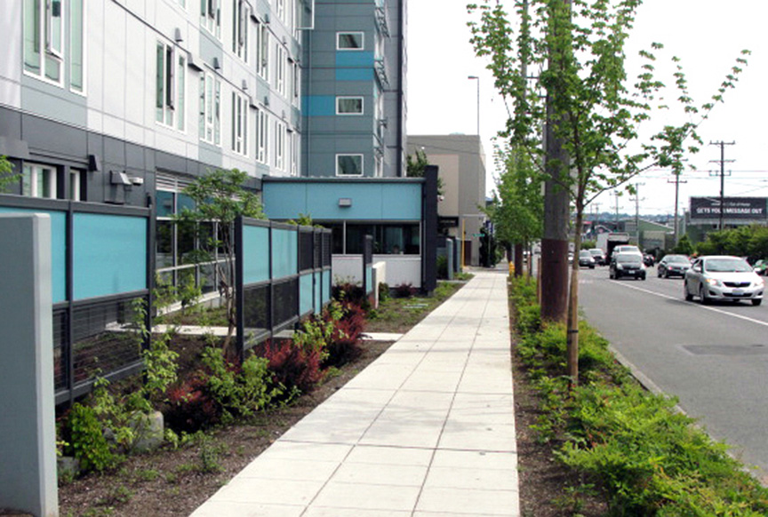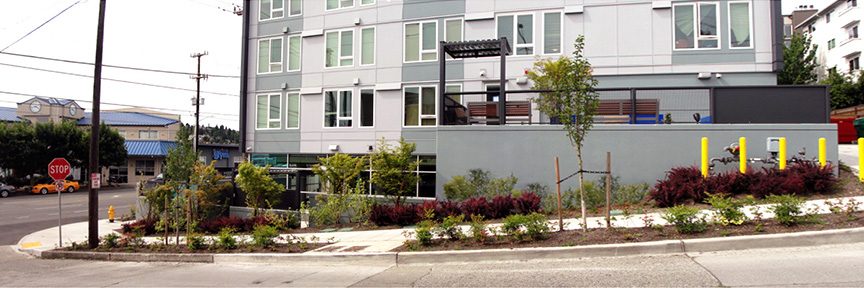 Fazio Associates collaborated with the client and design team to incorporate courtyards and raingardens into the landscape program. The use of raingardens and screens along 15th Ave. is to provide a sense of privacy and security to the residents. The resident courtyard landscape design, and landscape buffers surrounding the building are designed to buffer sound, retain soil, provide privacy from neighboring properties, and provide attractive, private outdoor space for residents and staff. P-patch planters at the upper terrace offer an area for tenants to plant their own gardens.