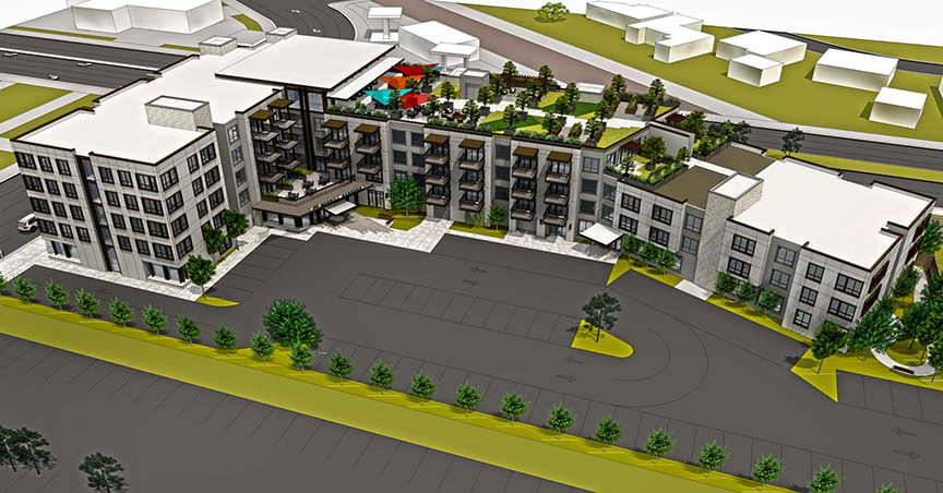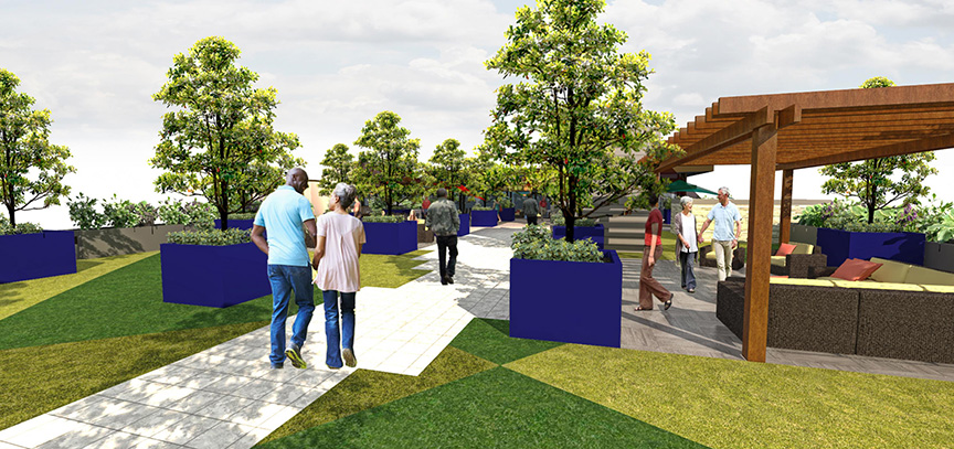 Fazio Associates is working closely with the design team at Urbal Architecture to create a variety of outdoor amenity spaces at the ground level and on the roof deck to give the residents a dynamic lifestyle. The streetscape will foster a lively pedestrian environment, with new street trees along South Sunset Avenue and West Covina Parkway, new sidewalk with accent paving and lighting, an integrated bus stop, and active building uses like a sidewalk dining area. Decorative low stone retaining walls and laser cut panels to screen Memory Care patio, water feature, and garden provide privacy to the tenants while creating an interesting edge facing the public realm. A pet park with accent lighting and a seat wall provides a safe place for pets to play. Trees and shrubs, raised planters, accent paving, benches, bollards, and a water feature all contribute to buffering the building from the parking lot while providing visual interest and mitigating the effects of a hot, dry climate. Green screen with climbing vines at key walls softens the façade.