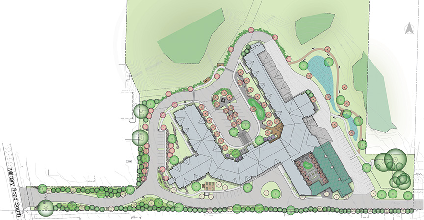 This Senior Housing project, located in the City of Tukwila, will house approximately 150 one-bedroom units of Independent, Assisted Living, and De¬mentia care components. About 24 of those units will be grouped together for Memory Care. A combination of integrated covered parking and areas of on-site parking will provide over 80 parking spaces throughout the project. This 4-acre site in Tukwila is characterized by a dramatic grade change from Military Road South down to the wetlands to the north and northeast side of the site, providing many opportunities to take advantage of the views, create a variety of active and pas¬sive landscapes, and engage with the edge of the untouched wetlands vegetation with overlooks and educational signage. Another advantage of this large site is the ability to retain multiple large existing trees, and plant new large trees to create a varied and lush landscape.