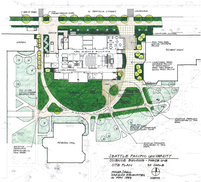 Fazio Associates role included site planning and landscape design that emphasized the preservation of historic existing elements while incorporating sustainable new elements. The planting and site design approach included a palette of drought tolerant plants, efficient irrigation system, and limited impact to the existing site. More than 50 percent of the exterior brick from the demolished Tiffany Hall has been used as pavers in the plaza and passive corridors adjacent to the new building. Many large elms were salvaged and incorporated into the overall design concept. This approach limited site design impacts and enhanced the integrity of the Seattle Pacific University campus layout.