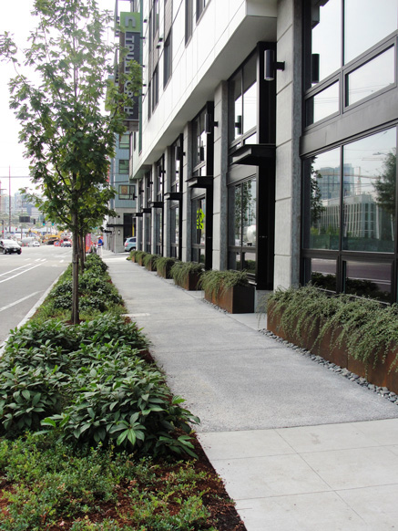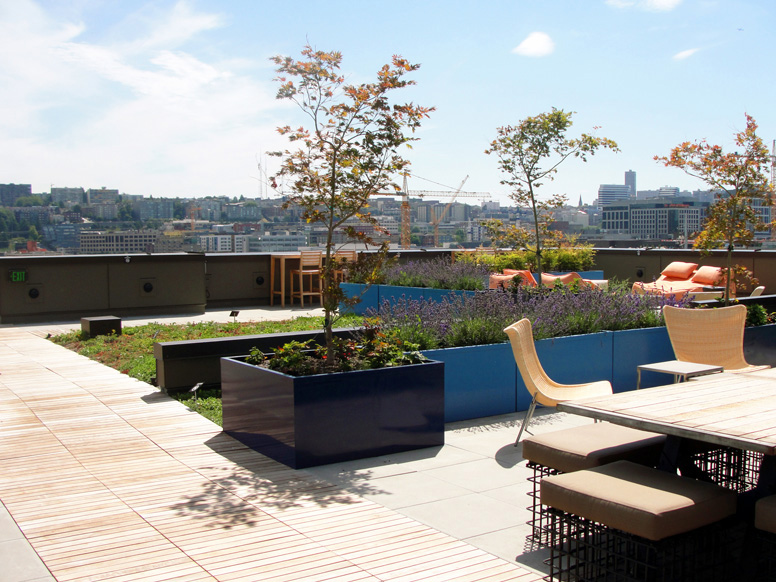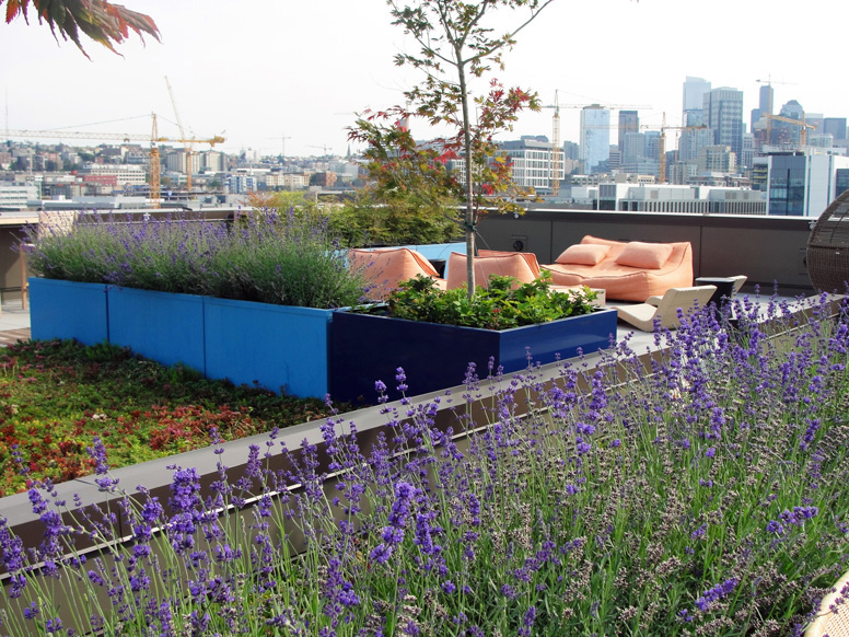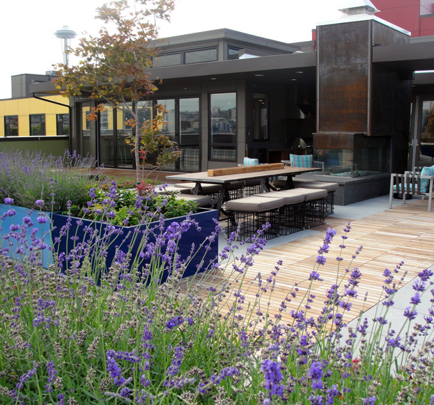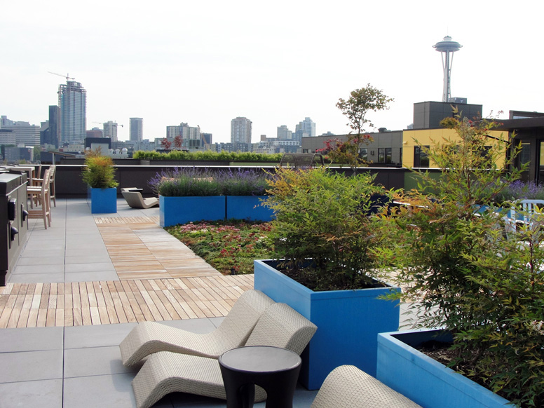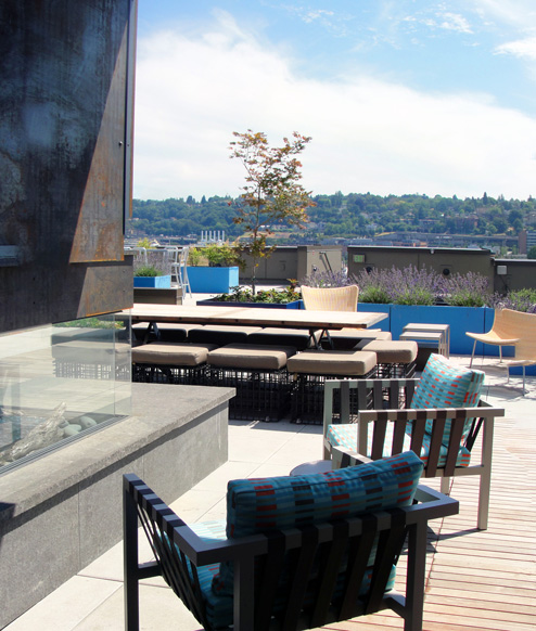The Level 8 amenity space features views of South Lake Union and downtown Seattle. The terrace amenities include; a covered area with outdoor pizza oven and BBQ, a double-sided fireplace with lounge seating, various private and semi-private seating areas, raised planters with drought-tolerant plantings for low maintenance, trough planters that are designated for Community Garden/Vegetable Cultivation for residents, over 3,000 SF of greenroof areas to help define the spaces, along with a 2,000 SF Pet Park that complements the overall goal of creating a micro-community within the overall neighborhood context of Queen Anne and South Lake Union.