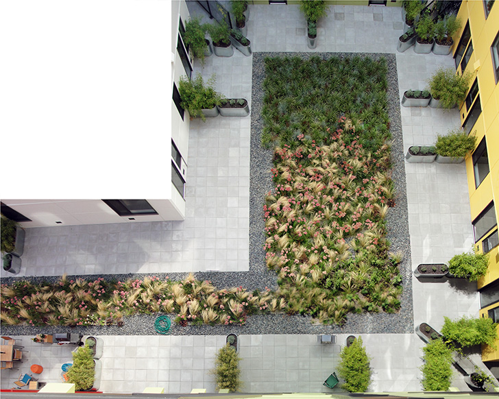 The internal 3rd level terrace includes private patios facing a large 8”-greenroof meadow that helps define spaces. The greenroof element consists of two separate meadow mixes to add contrast to the space while taking on river-like characteristics.